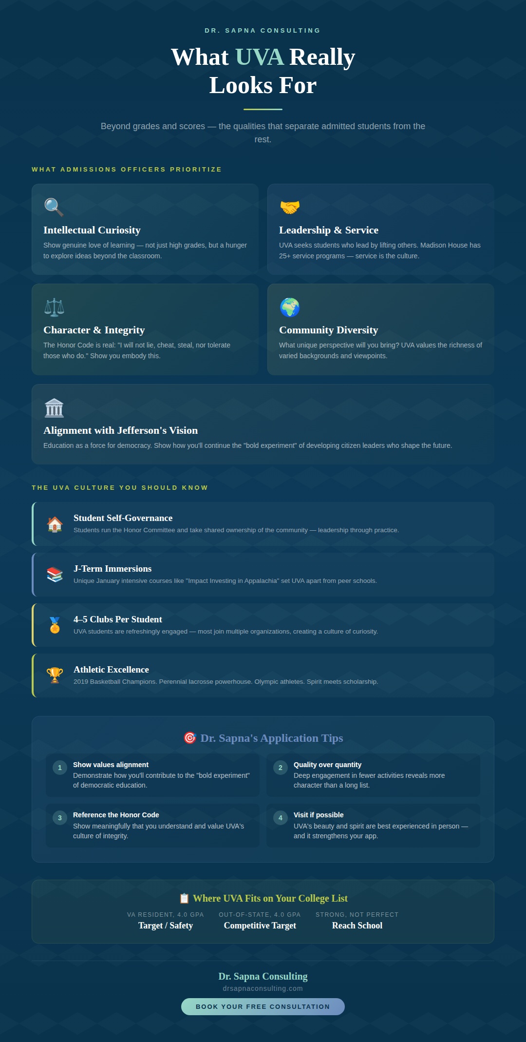 As your college admissions consultant, I always advise students to demonstrate these qualities authentically in their University of Virginia application.